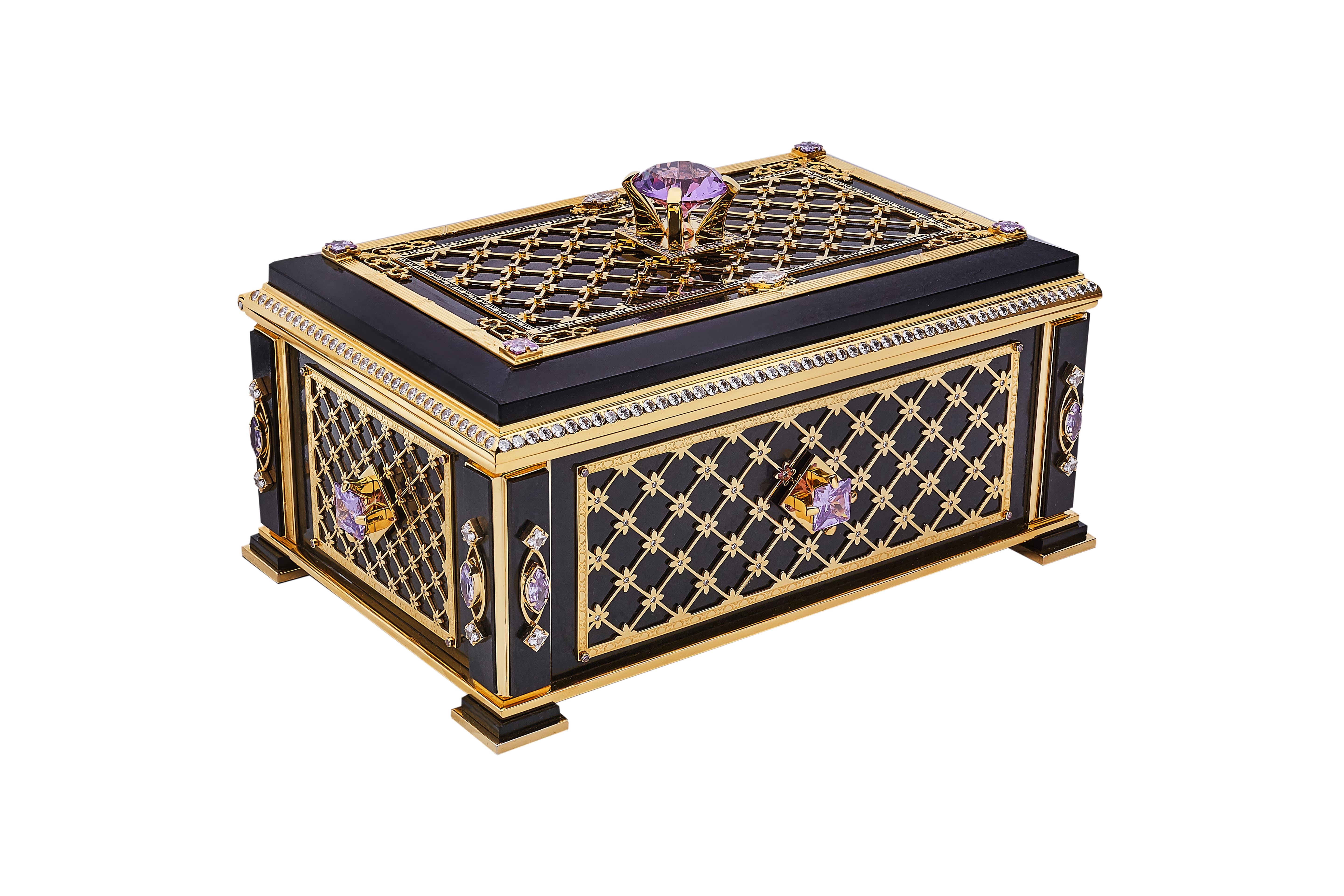 Чёрный нефрит был избран основой: камень, вобравший в себя глубину небес и силу времени. На его мрачной глади золотые узоры засияли как звёздные созвездия, а сверкающие фианиты превратились в крошечные светила, ведущие путь сквозь тьму. Но именно нежные кристаллы лилового оттенка стали сердцем этой легенды: они символизировали места, где рождаются новые звёзды, — таинственные туманности, из которых рождается свет.