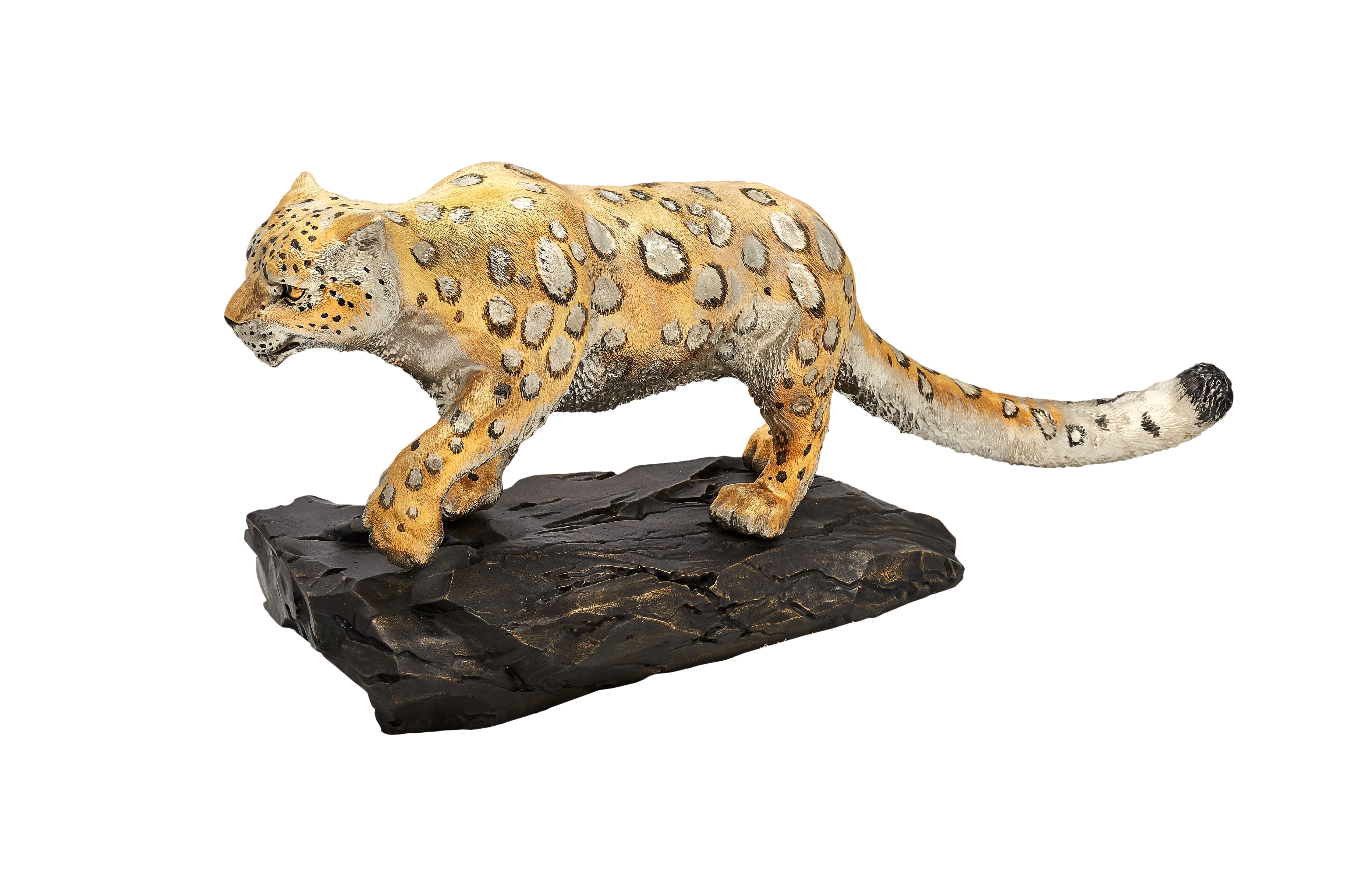 Снежная, сакральная красота барсов воплощена в элегантном облике и уникальной окраске, которая сама по себе является произведением искусства – дымчато-серая или палево-серая с такими же характерными кольцеобразными и сплошными пятнами, как у настоящих ирбисов. Изящный и выполняющий важные функции балансира и обогрева длинный хвост воссоздан с соблюдением пропорций – в природе он равен длине тела животного, а иногда даже превышает ее. Большие и выразительные глаза подчеркивают красоту и мудрость снежных барсов. Динамика изящных гибких тел придает скульптурам энергетику и мощь «призраков гор», таинственных и от этого еще более прекрасных.