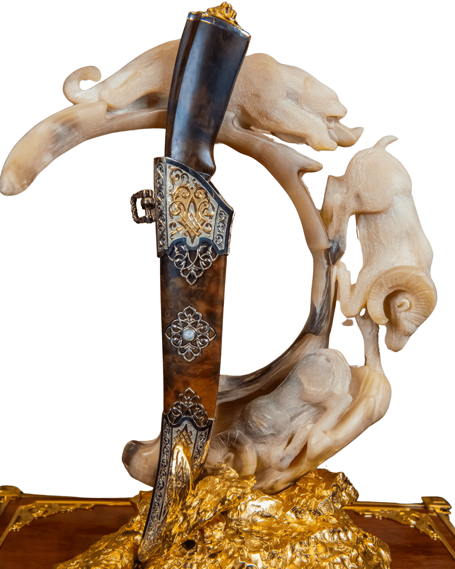 Материалом для создания сцены охоты послужил рог архара. Подставкой для ножа является стилизованная скала из бронзы, покрытая золотом. Нож в ножнах уравновешивает композицию и является ее центром, будучи неизменным атрибутом охотника. Строгий и лаконичный орнамент украшает изделие и подчеркивает минималистичность и аскетизм, присущие мужчинам-охотникам.